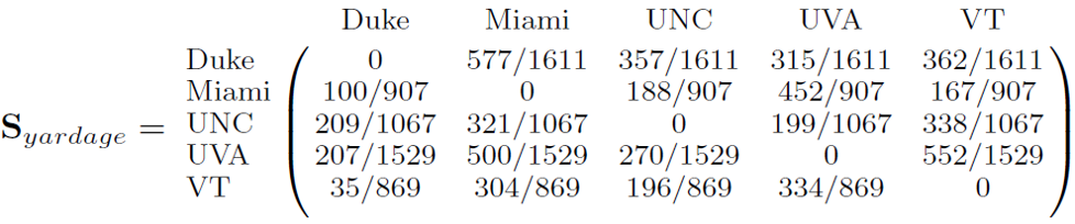 \[\mathbf{S} = \alpha_1 \mathbf{S_{points}} + \alpha_2 \mathbf{S_{yard.}} + \alpha_3 \mathbf{S_{turn.}} + \alpha_4 \mathbf{S_{poss.}}\]