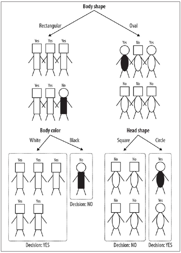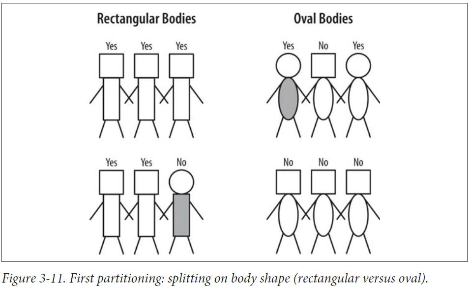 node \(\rightarrow\) leaves represents a segmentation that increases purity, i.e., decreases information Entropy or Gini impurity.