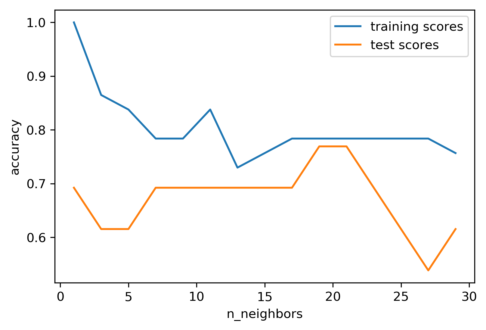 1-NN is perfect on training but 0.7 on test.