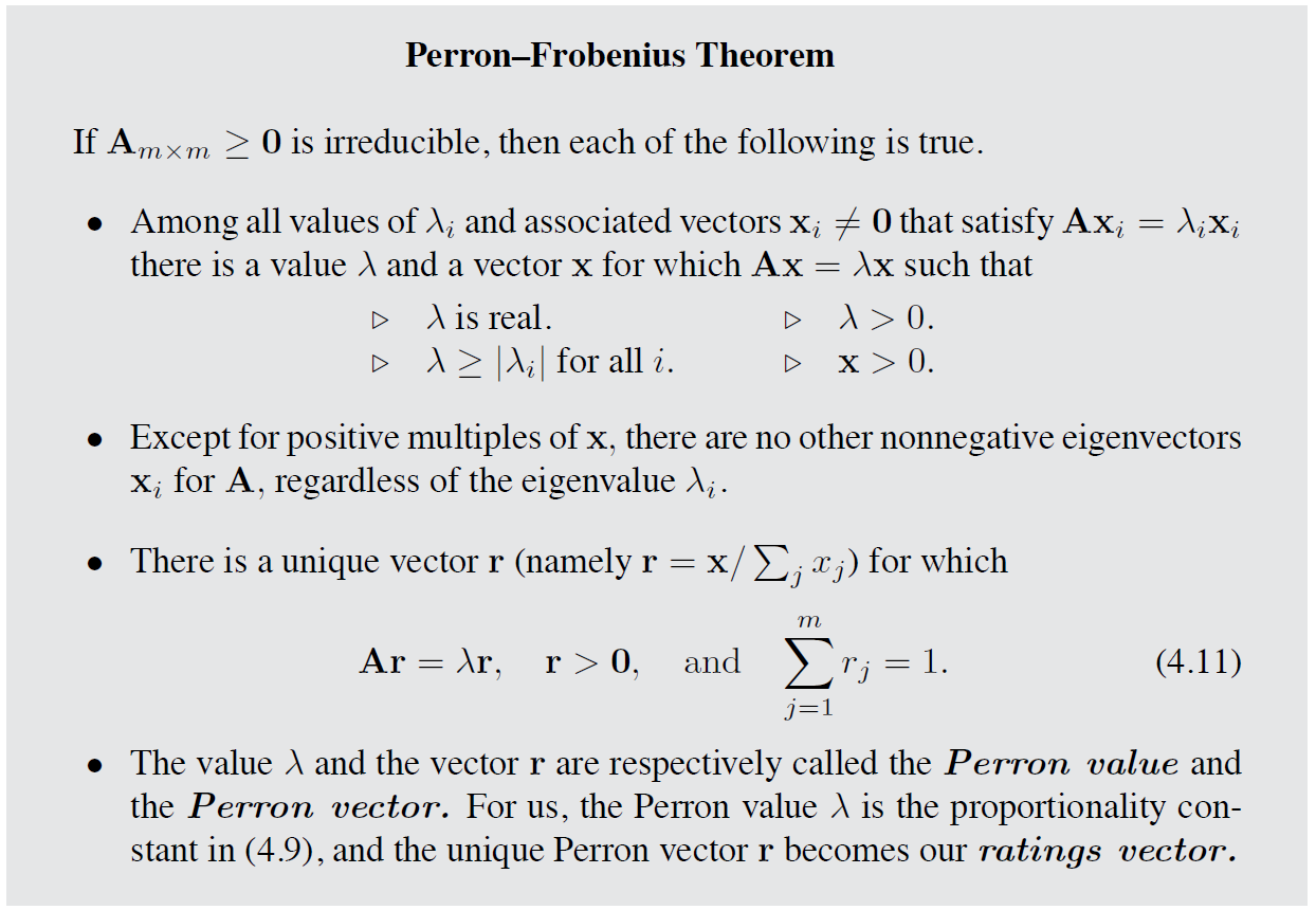 [Keener, SIAM Review 35:1, March 1993] is credited with seeding the ideas behind Google’s PageRank.